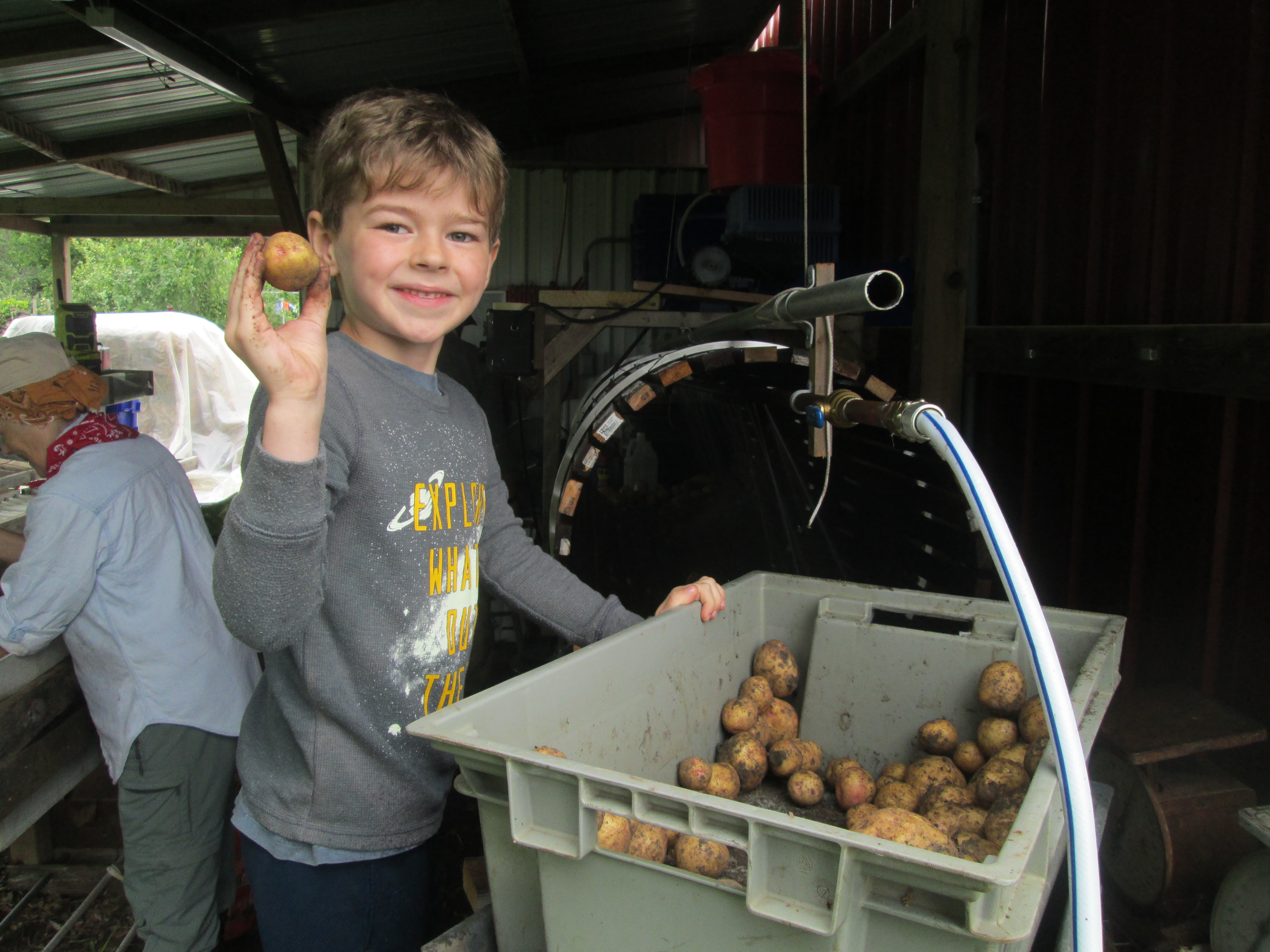 Our son Nathan was born in February of 2012. Nathan can play with Legos for hours at a time but hasn’t yet realized the soul-filling benefits of weeding carrots in the hot sun all day. Nathan is in fourth grade in Watertown and loves puzzles, playing violin, and guinea pigs. This past summer he started helping with stuffing potatoes and carrots in our barrel washer and transporting cucumbers.